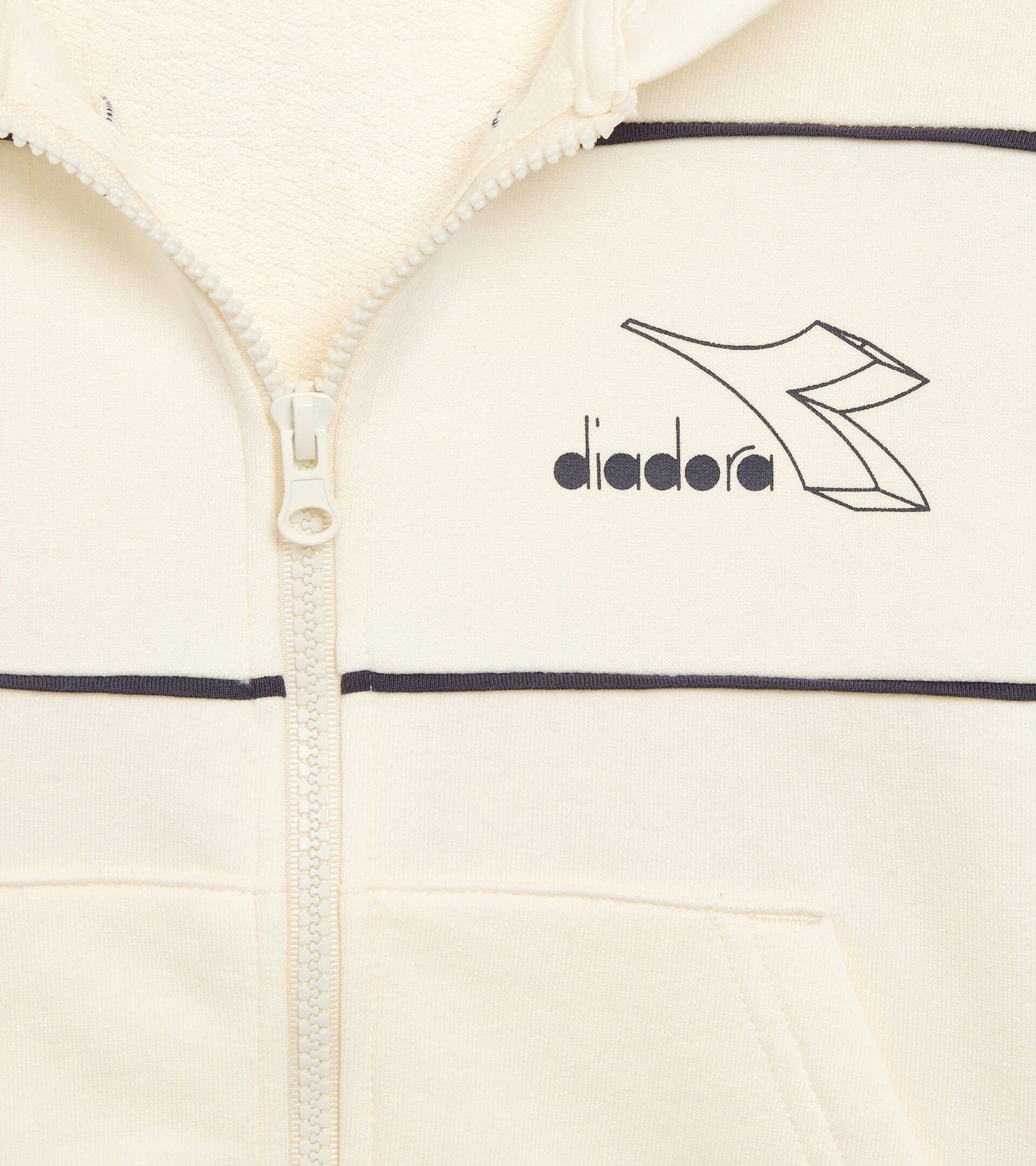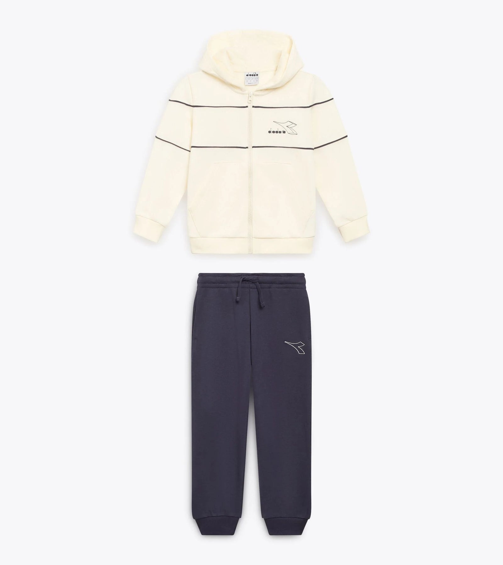 Tuta completa della Diadora Franch Terry (cotone non felpato). La felpa è full zip con cappuccio e il pantalone ha il polsino e l'elastico in vita. Colore: Panna, Blu.